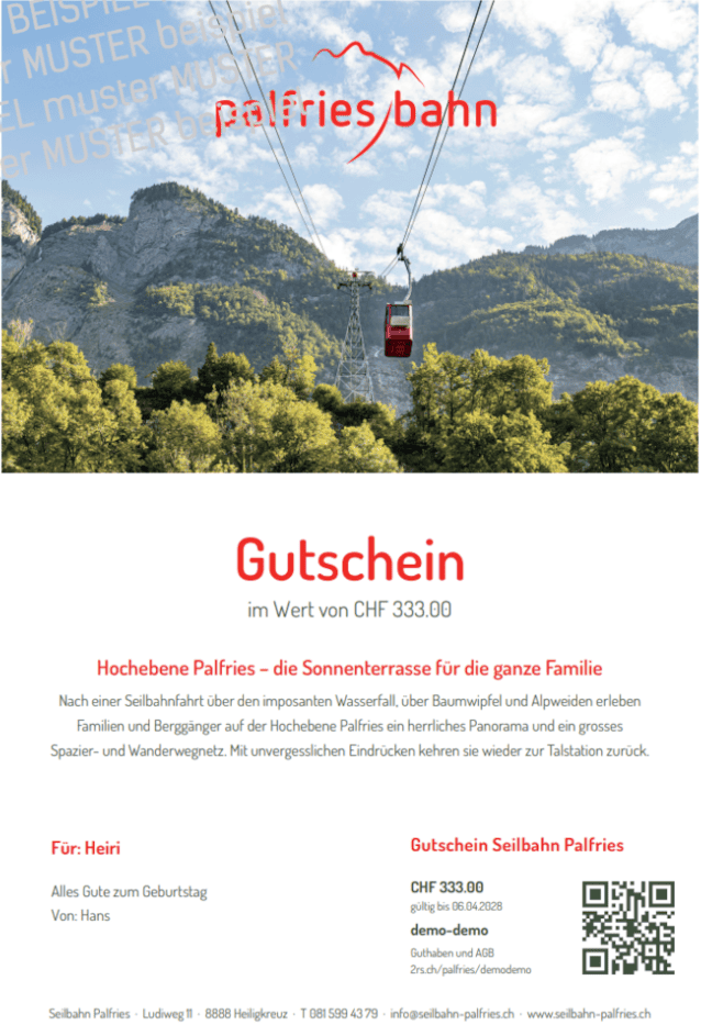Ein praktisches Beispiel für die Anwendung des Gutscheinsystems von 2reserve ist die Bergbahn Palfries. Seit der Einführung von 2reserve bietet die Bergbahn Wertgutscheine über das System an, die sowohl funktional als auch optisch ansprechend gestaltet sind.