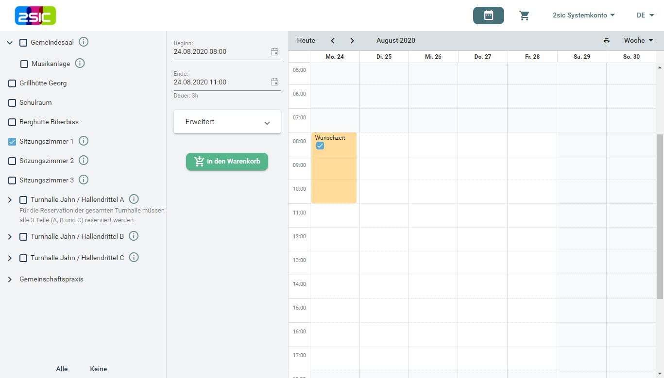 Nachdem du die Auswahl des zu buchenden Raumes getroffen hast erscheint in Gelb dein Wunschtermin. Sobald dieser via Warenkorb gebucht wurde, erscheint dieser bei allen Neubuchungen fix und mit der jeweiligen Farbe hinterlegt.