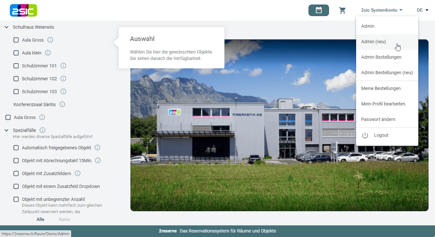Um auf den neuen Admin-Bereich zuzugreifen, einfach unter deinem Benutzernamen oben rechts klicken und "Admin (neu)" wählen (siehe Screenshot unten). Schon bist du auf der neuen Admin-Übersicht und kannst mit der Verwaltung deiner Objekte und Reservationen starten. Bis ca. Ende Januar 2022 steht dir weiterhin noch die alte Benutzeroberfläche zur Verfügung.