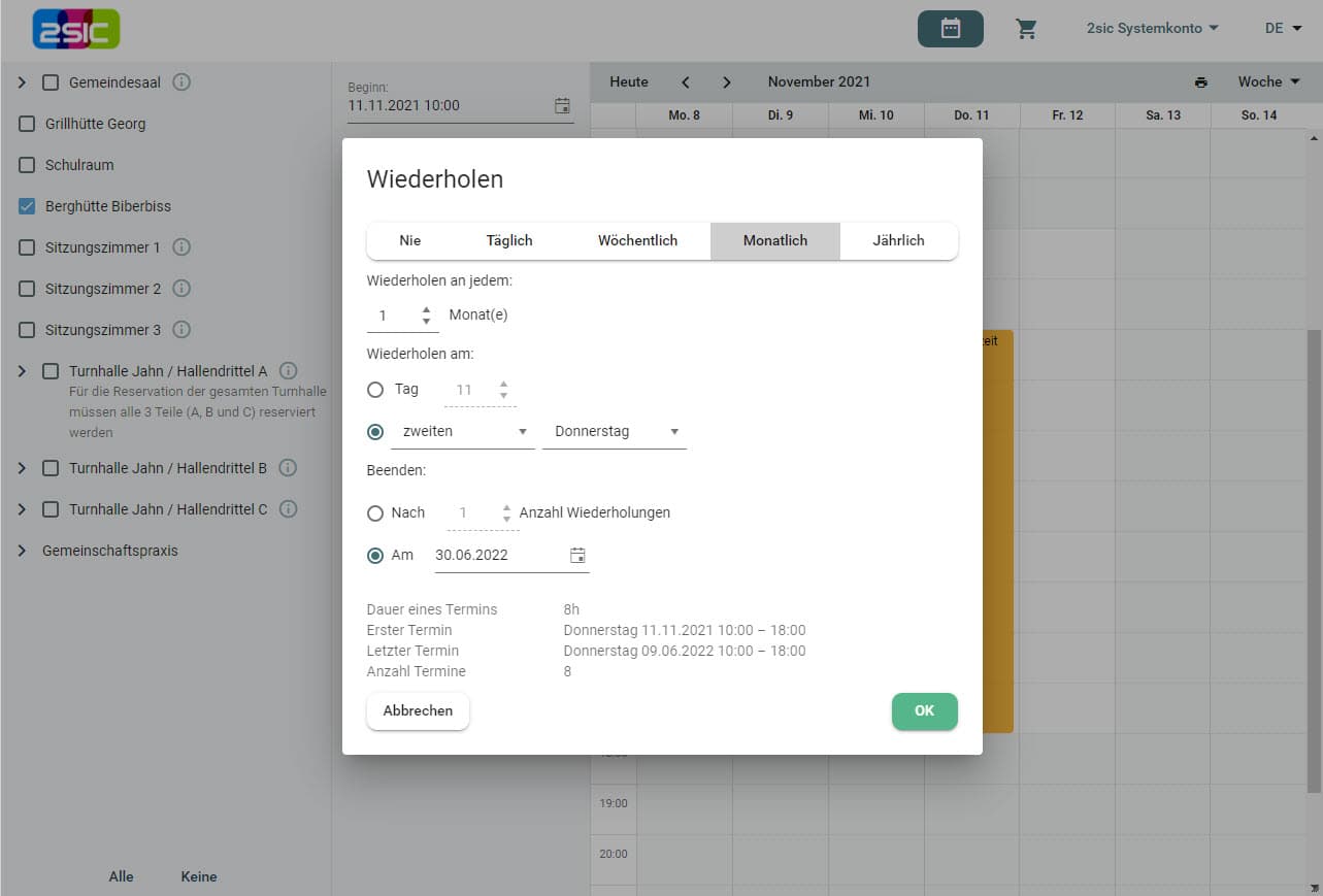 Der Kunde / Gast wählt das zu buchende Angebot und den entsprechenden Zeitraum mittels integrierter Datum und Zeitauswahl. Er bestimmt den Zeitraum der Reservation, diese wird im Kalender Gelb hinterlegt, sofern der gebuchte Termin frei ist.