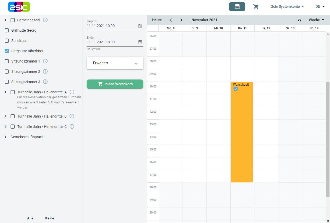 Nachdem du die Auswahl des zu buchenden Raumes getroffen hast erscheint in Gelb dein Wunschtermin. Sobald dieser via Warenkorb gebucht wurde, erscheint dieser bei allen Neubuchungen fix und mit der jeweiligen Farbe hinterlegt.